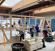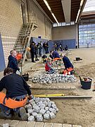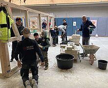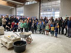 22 Kinder kamen mit ihren Eltern zu uns und konnten, ausgestattet mit Arbeitshandschuhem, gemeinsam mit Auszubildenden, Mauern, Mörtel anrühren, Pflastern und auch einmal im Minibagger sitzen.